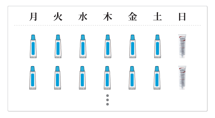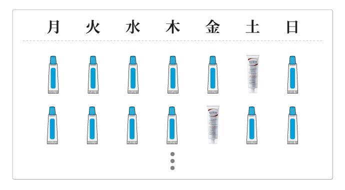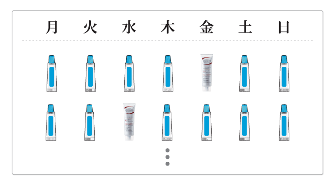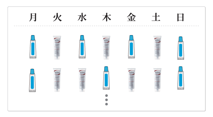 毎日お薬を使用中の場合、7日のうち6日薬を塗って1日は保湿剤などのスキンケアだけ。 以下のパターンをしばらく(※)継続して症状が悪化しなければ次の段階へ進みます。