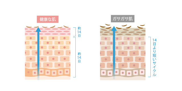 肌に炎症が起こるとターンオーバーが短くなり、28日に満たない周期で肌表面に押し上げられてしまいます。通常よりも短い周期でターンオーバーを繰り返した角層ははがれやすく、脆弱な状態になりバリア機能が低下しています。