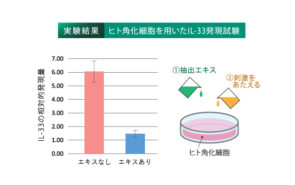 人の皮膚(角化)細胞を用いて、刺激を受けた際に増加するタンパク質(IL-33)の変化を測定したところ、APD竹エキスを添加した細胞では、IL-33の増加が約1/4に抑えられるという結果が得られました。