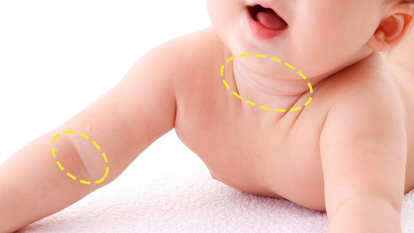 首や関節の内側など常に皮膚が重なった状態になることが多く、ムレた状態でこすれるため、皮膚のシワに沿って筋状に赤い状態になります。